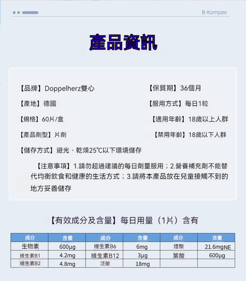 半小時前【德國燃脂養髮維他命B族咀嚼片】德國進口,Doppelherz雙心維他命B族,葉酸,熬夜疲勞代謝膳食咀嚼片60粒/盒!全新上市新型減重藥物-體重控制釋放錠,安全無副作用,促進身體代謝,效果加倍!!【瘦到你尖叫】加速燃燒脂肪,健康享瘦更輕鬆!! - 【無效全額退費】【大餐必備】【新品嘗鮮價】買一送一 2入組僅需NT$998